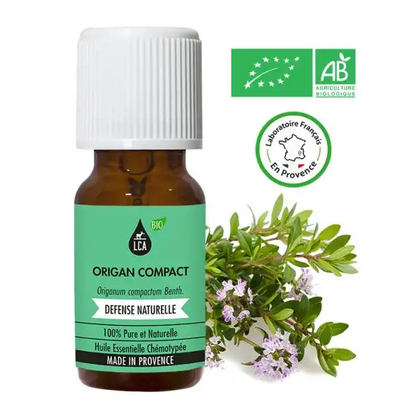 10 ml Nom botanique : Origanum compactum Benth. Procédé d’obtention : distillation par vapeur d’eau Partie de la plante extraite : sommités fleuries Chemotype : carvacrol, thymol Ingrédients : Huile essentielle d’Origan compact* (Origanum compactum Benth.) AB BIO